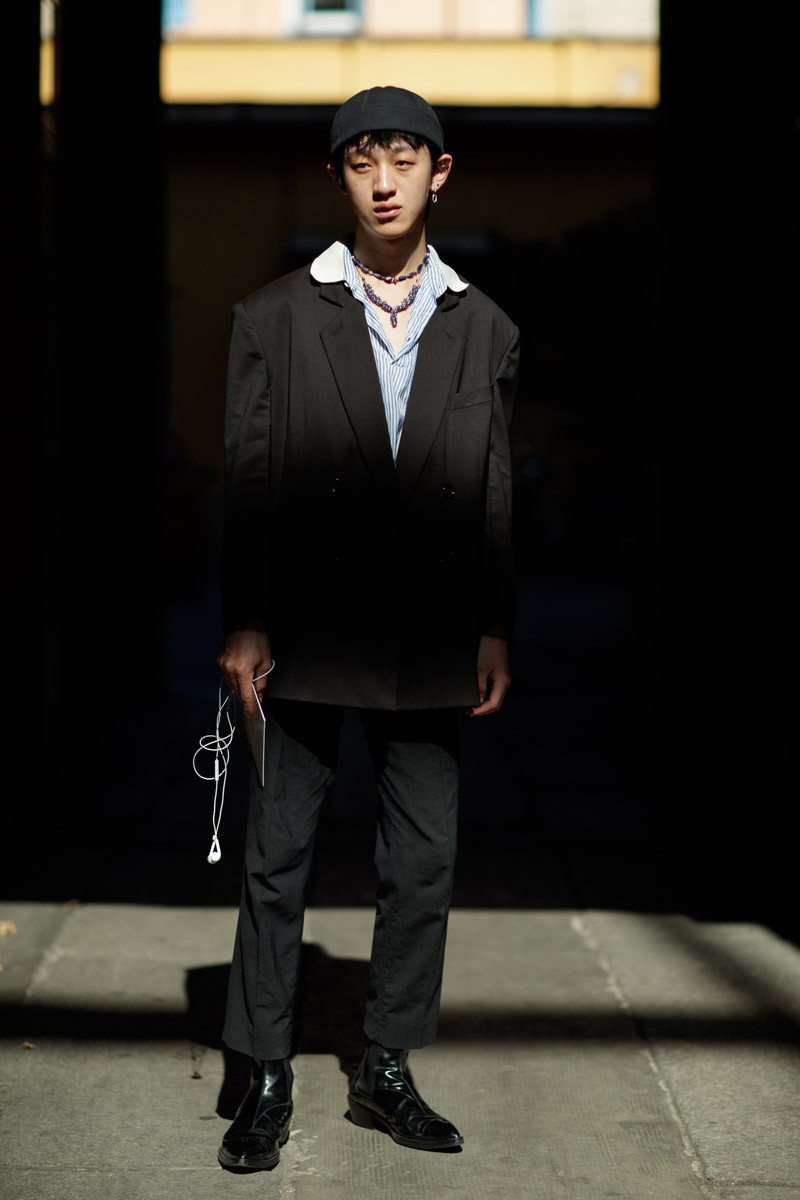 we can see tailored dressing done 2018 style with a pair of structured pants, and a gray houndstooth blazer elevated with some silver chains and a nylon waist pack from Prada (we are in Milan, after all)